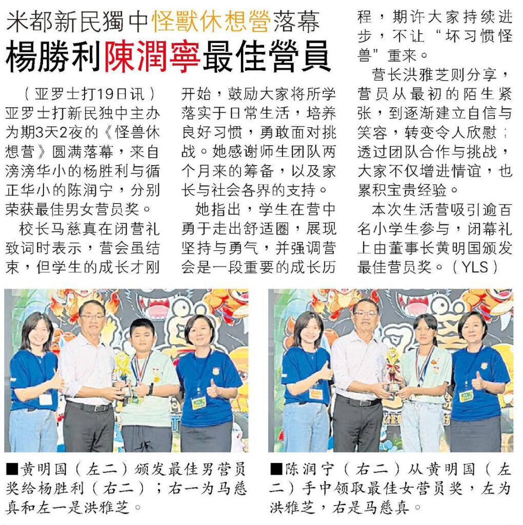 (亚罗士打19日讯)亚罗士打新民独中主办为期3天2夜的《怪兽休想营》圆满落幕,来自旁旁华小的杨胜利与循正华小的陈润宁,分别荣获最佳男女营员奖。